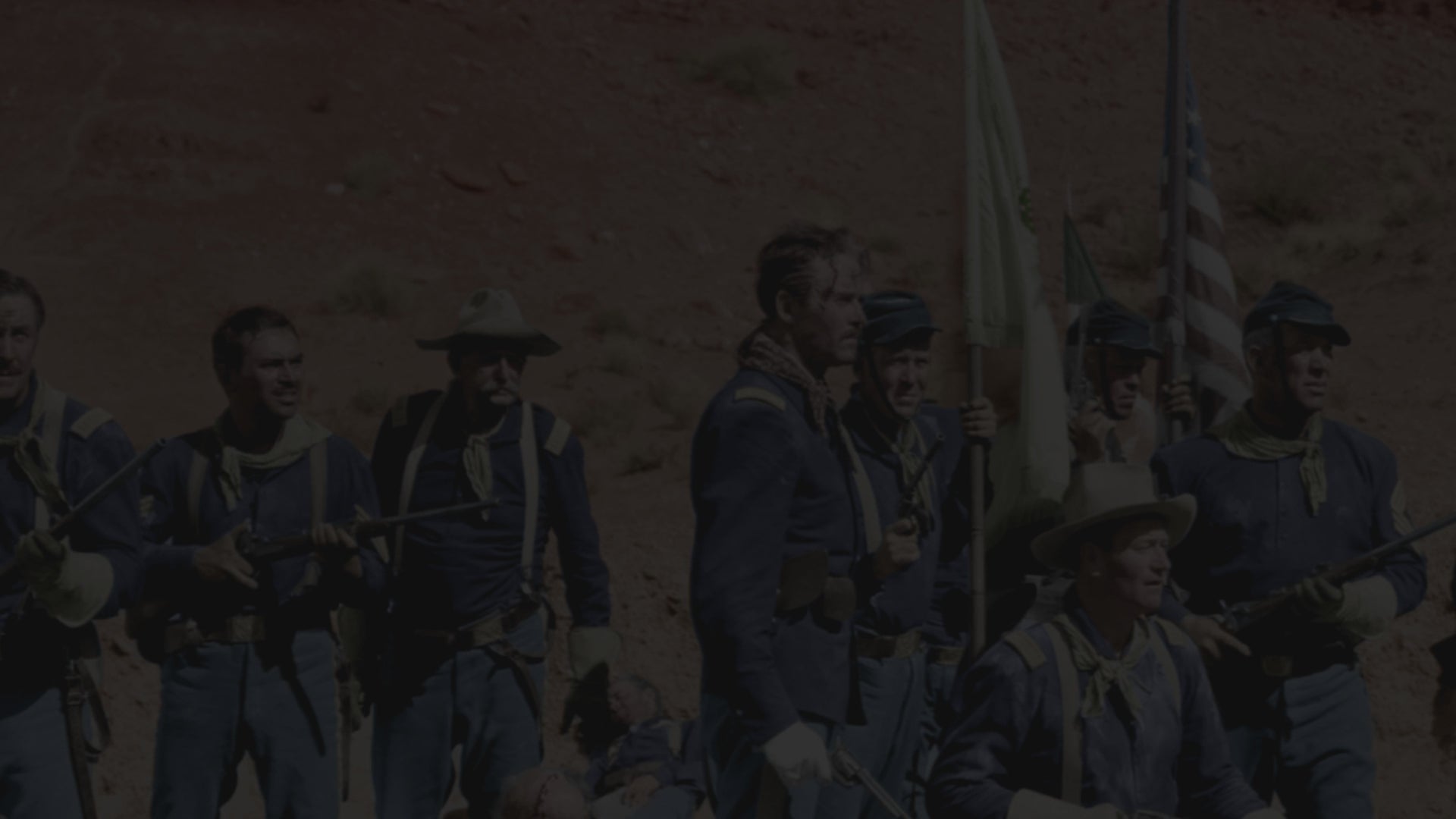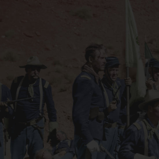 - CLASSIC WESTERN: Stunning scene from John Ford's 'Fort Apache' featuring iconic desert landscapes and military formations against red rock cliffs