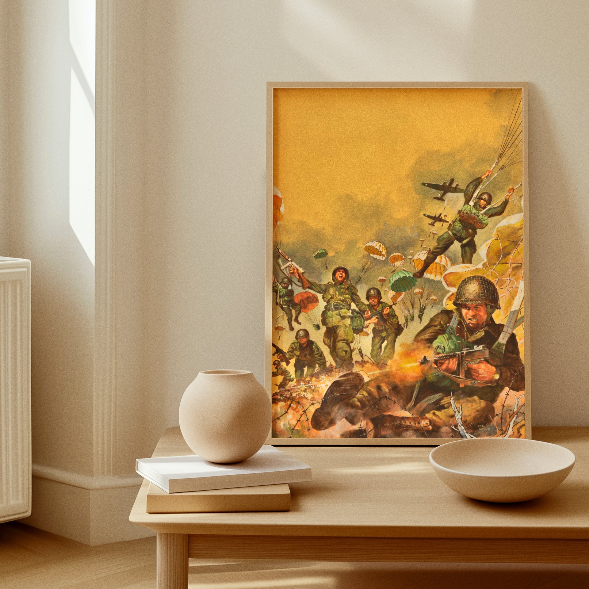 - VINTAGE ARTWORK: Dramatic military battle scene featuring paratroopers in action during World War 2, capturing intense combat moments with detailed illustration