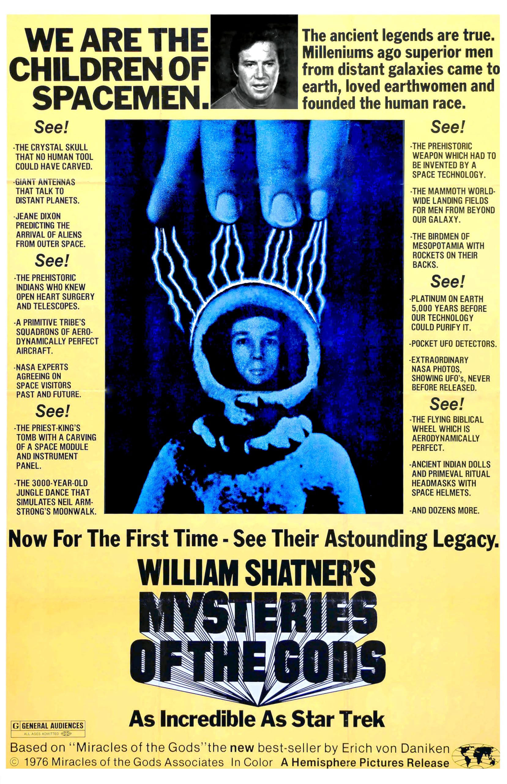- VINTAGE DESIGN: High-quality 11"x17" poster print featuring the iconic 1976 documentary 'Mysteries of the Gods' with striking blue and yellow color scheme
