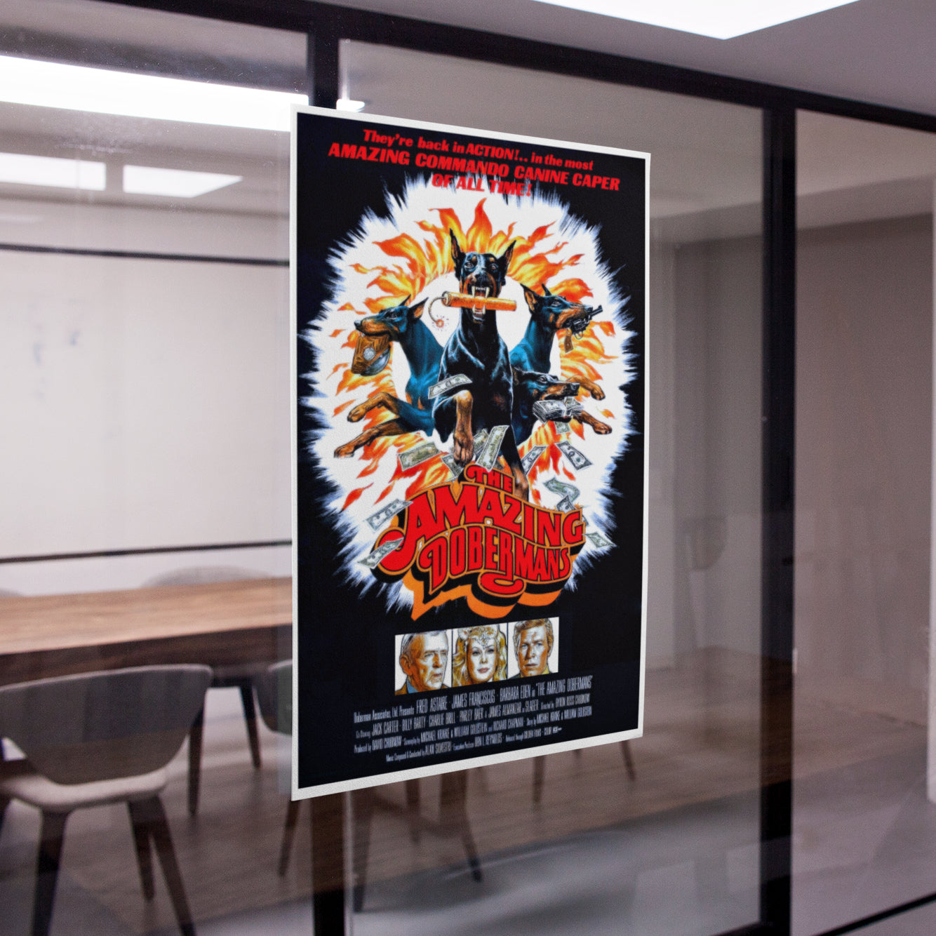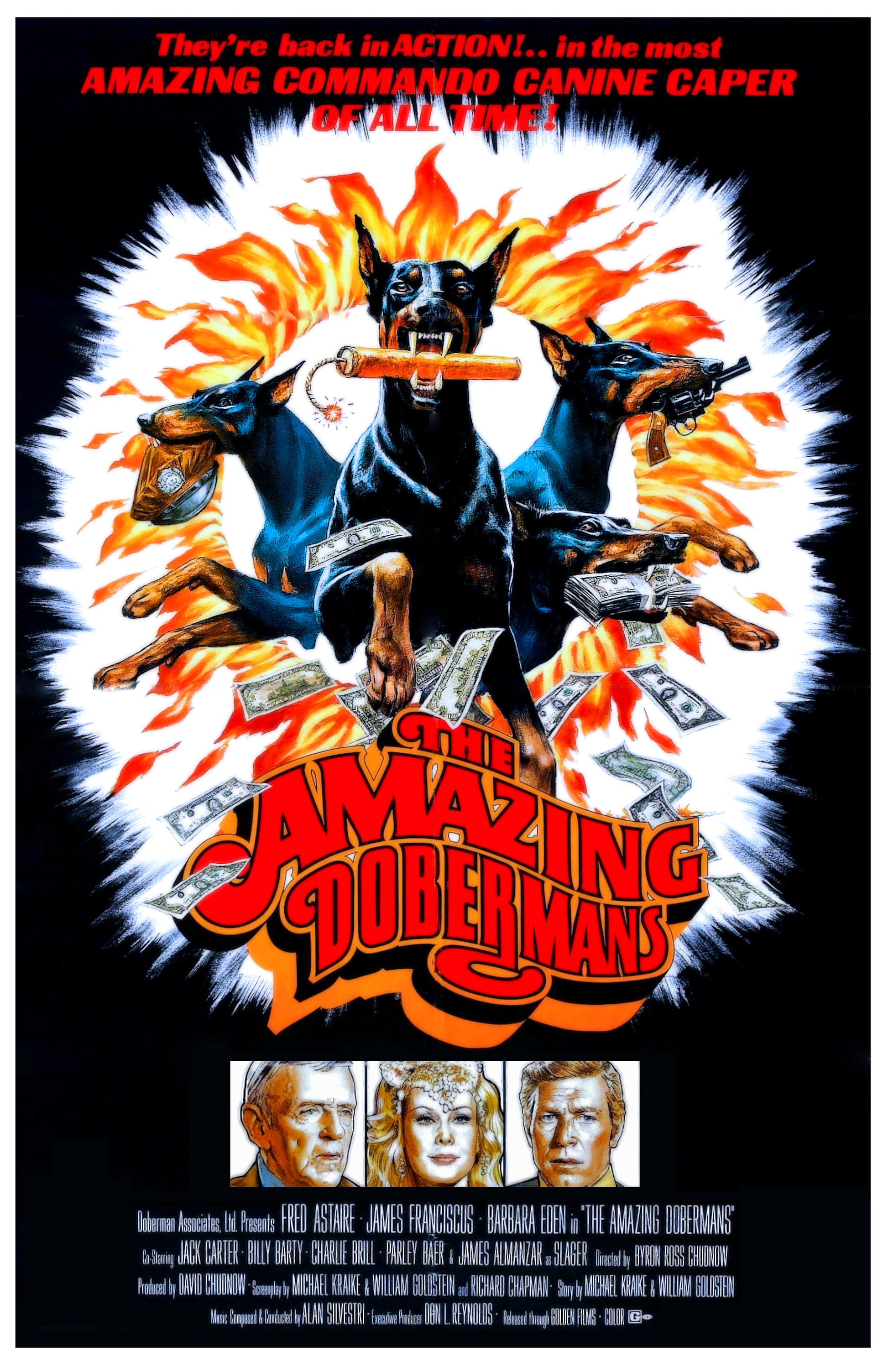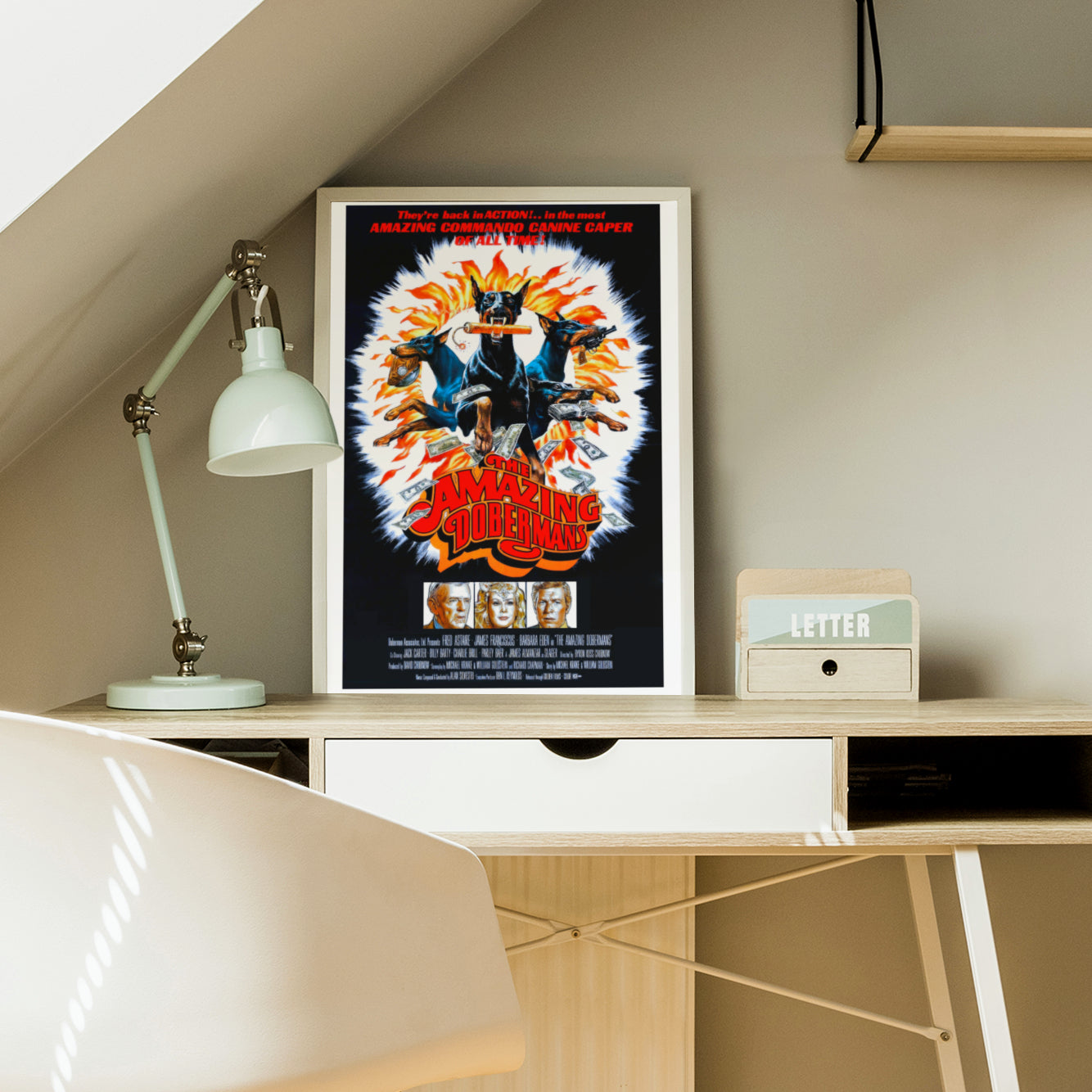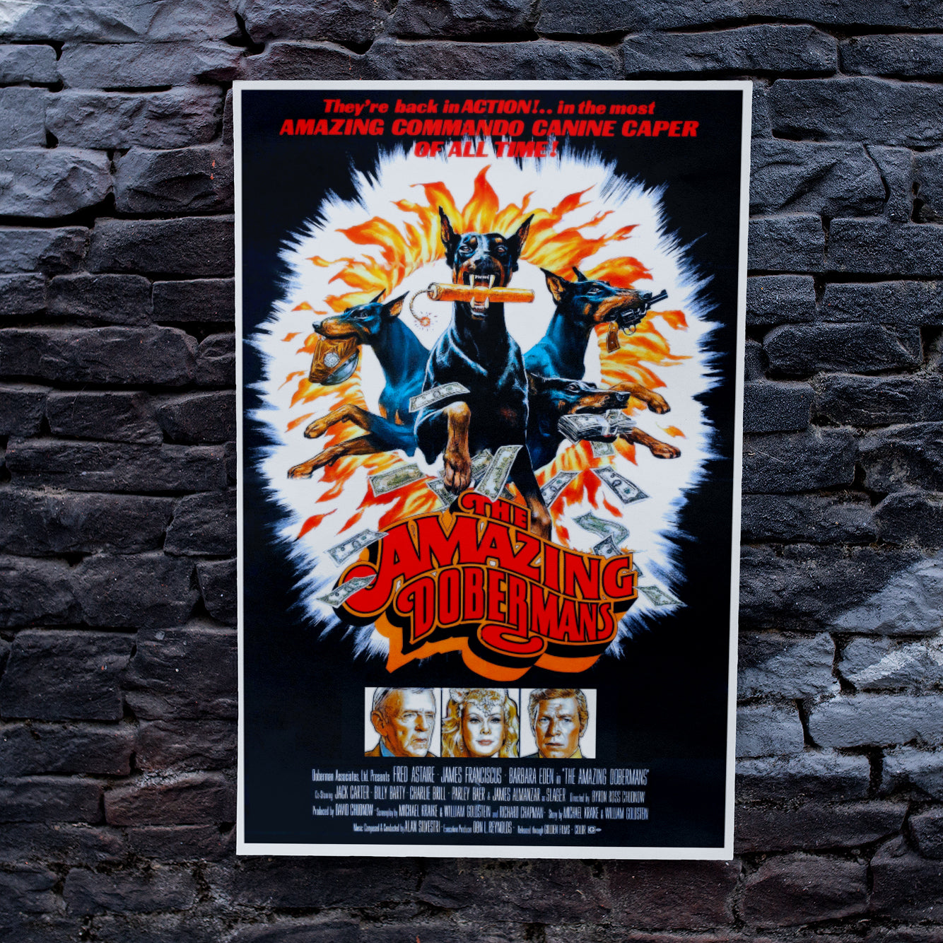 - VINTAGE DESIGN: High-quality reproduction of the 1976 action-comedy film poster featuring dynamic artwork of three Doberman dogs against an explosive background